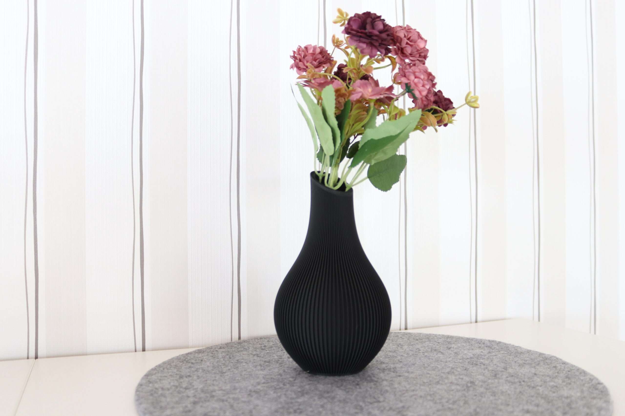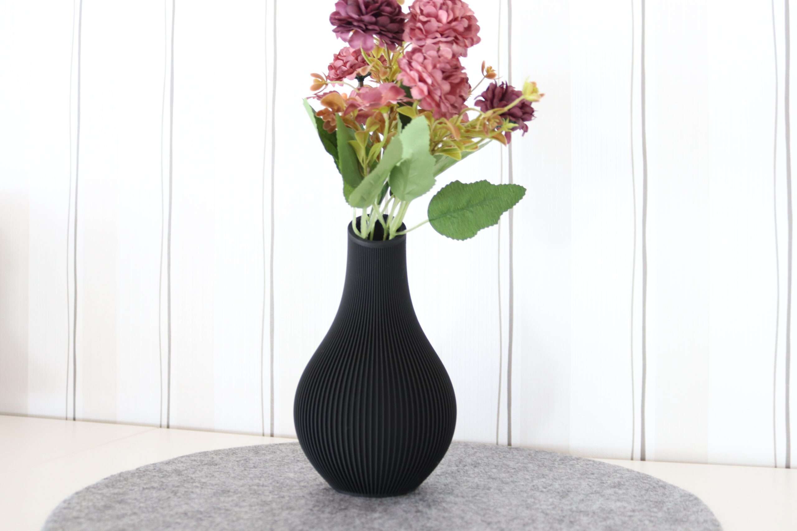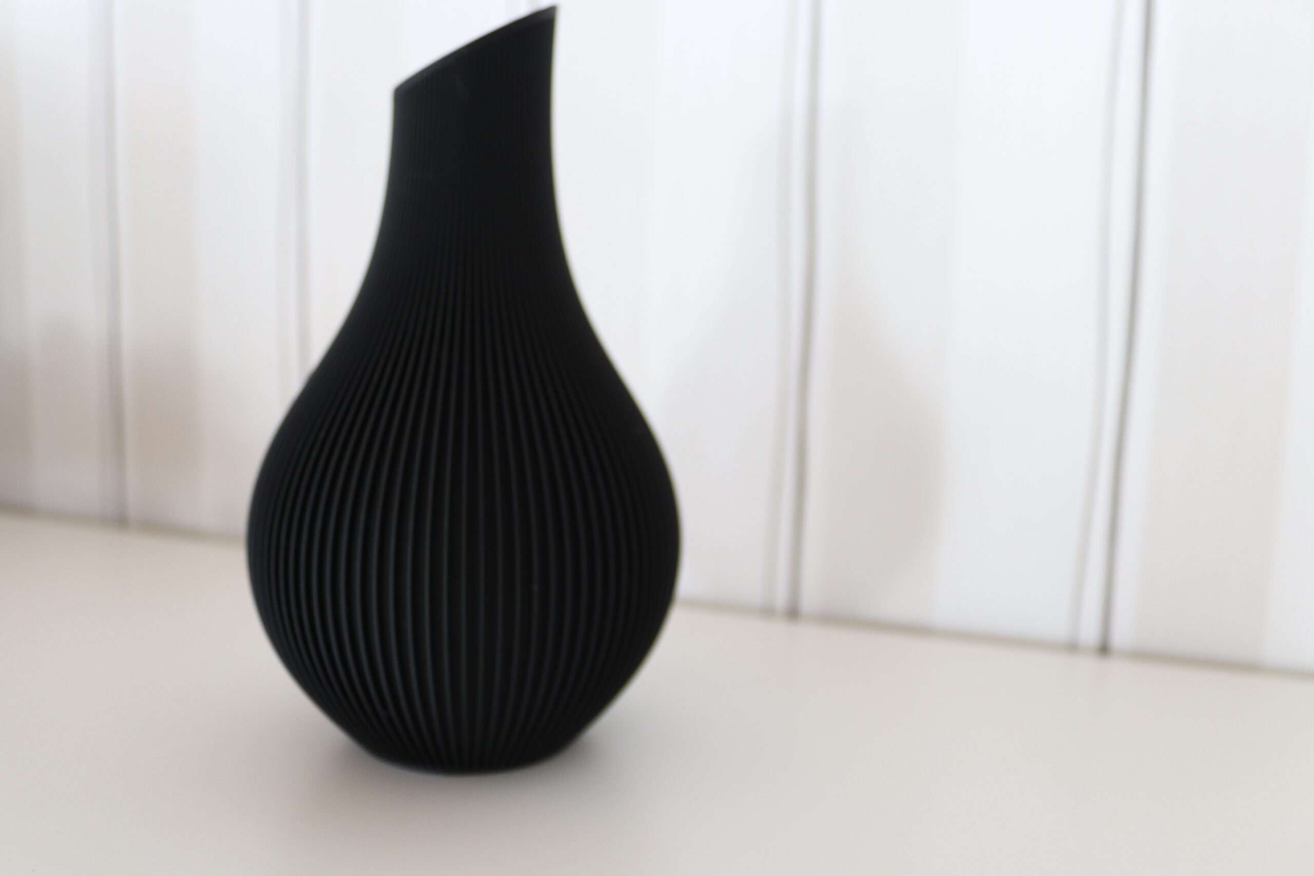 Diese stilvolle Vase wurde aus schwarzem PLA-Kunststoff im 3D-Druckverfahren gefertigt und überzeugt durch ihr modernes, minimalistisches Design. Die fein gearbeitete, gerillte Oberfläche verleiht ihr eine besondere Haptik und sorgt für ein elegantes Spiel aus Licht und Schatten.