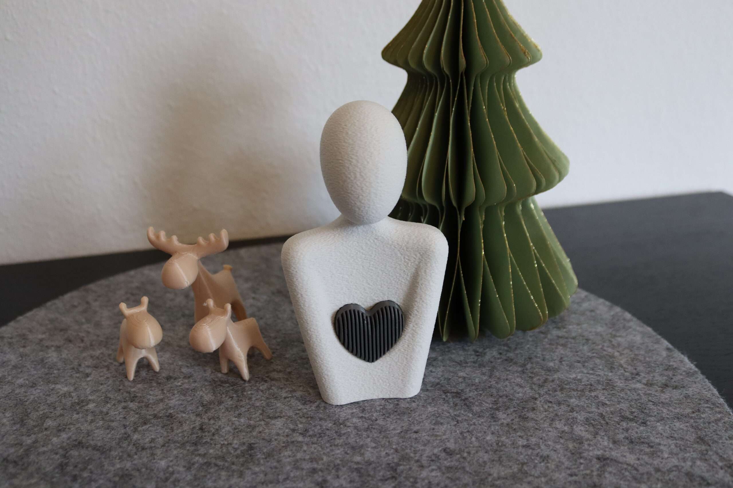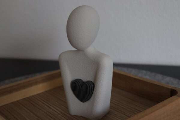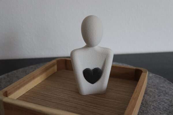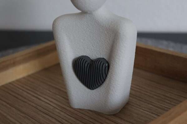 Die Figur wird im hochwertigen 3D-Druckverfahren aus biologisch abbaubarem PLA hergestellt – ein nachhaltiges Material, das modernes Design mit Umweltbewusstsein verbindet. Das eingearbeitete, gerillte Herz in elegantem Schwarz verleiht der Figur eine besondere Tiefe und symbolische Aussagekraft.