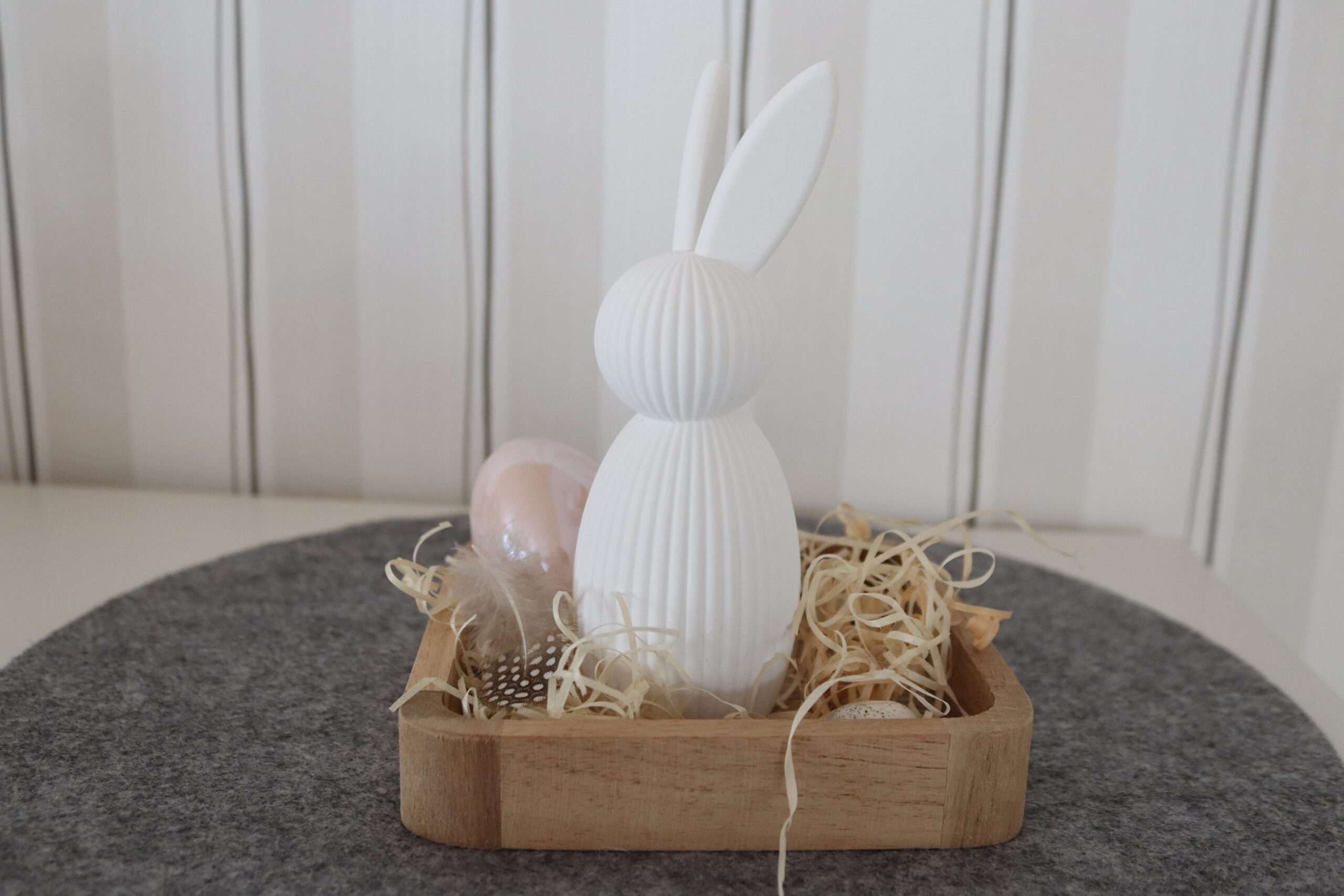 Dieser moderne Deko-Osterhase bringt minimalistisches Design und schöne Atmosphäre auf stilvolle Weise zusammen – perfekt für alle, die Wert auf nachhaltige und kreative Dekoration legen.