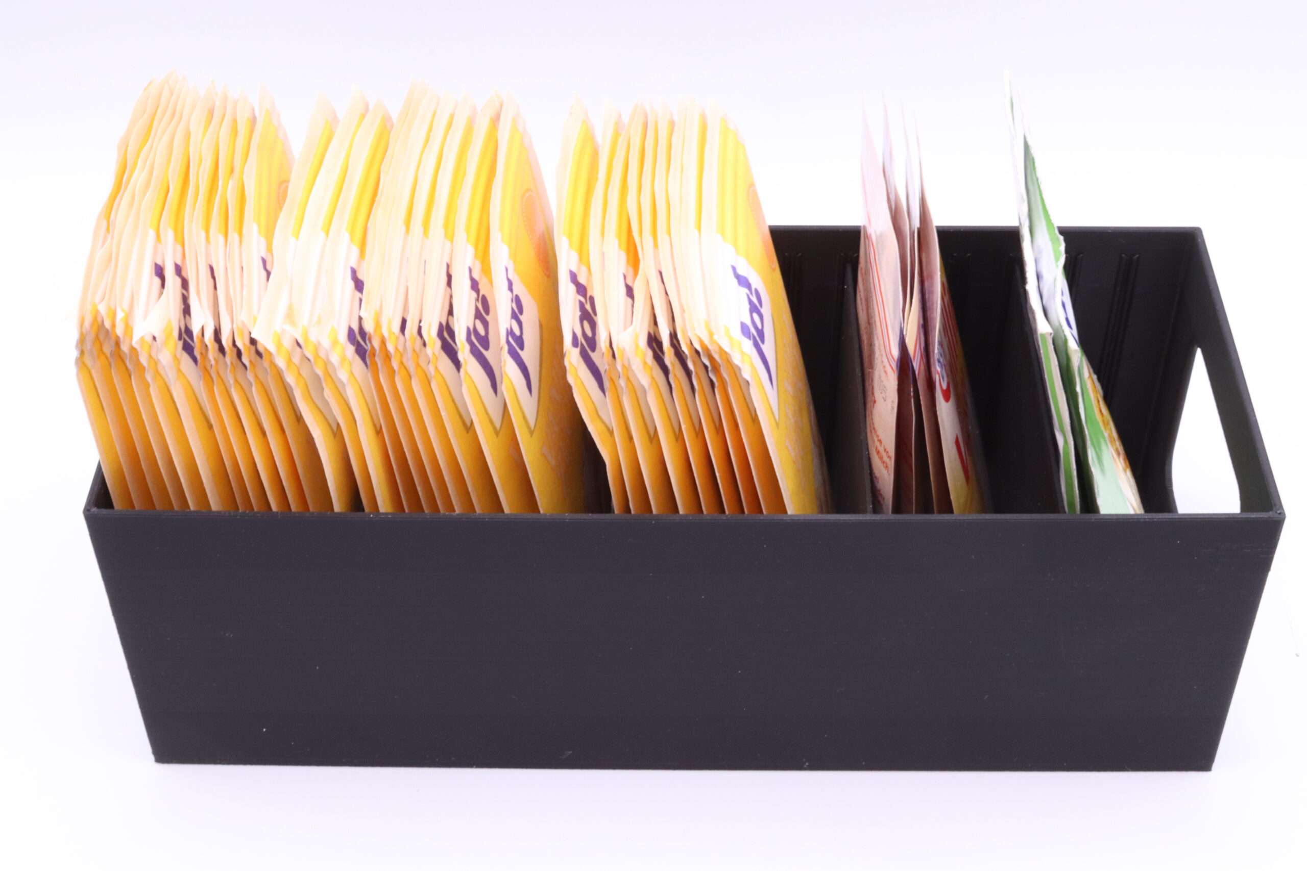 Zudem können bei dem Design auch bereits geöffnete Tüten wieder eingelagert werden, ohne dass der ganze Schrank dreckig wird.